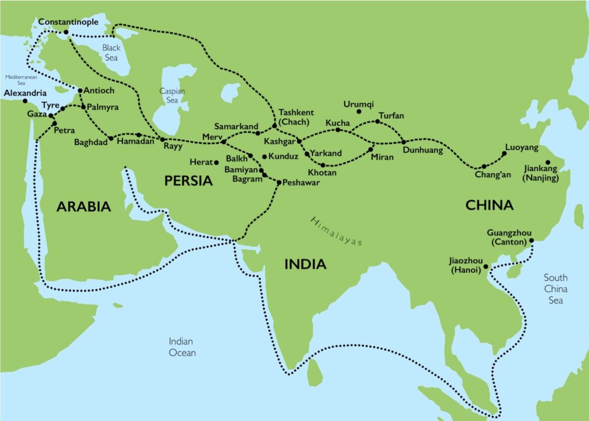 実はシルクロードは一本の道ではなく、中央アジアを横断する陸のルート(天山北路、天山南路など)と、海上ルート(海のシルクロード)を含む広範なネットワークです。