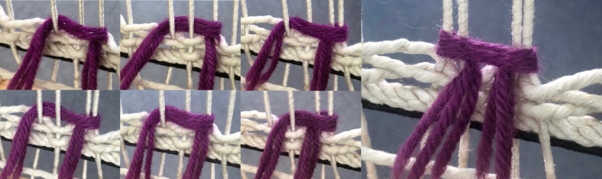 パイルを一例結び終わるたびに1〜3本の横糸を通し、緯打具で叩いて固定しますが、横糸の本数によりシングル・ウェフト、ダブル・ウェフト、トリプル・ウェフトに分けられます。