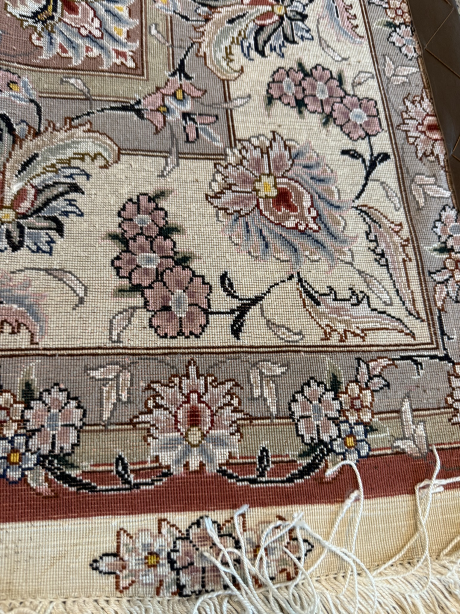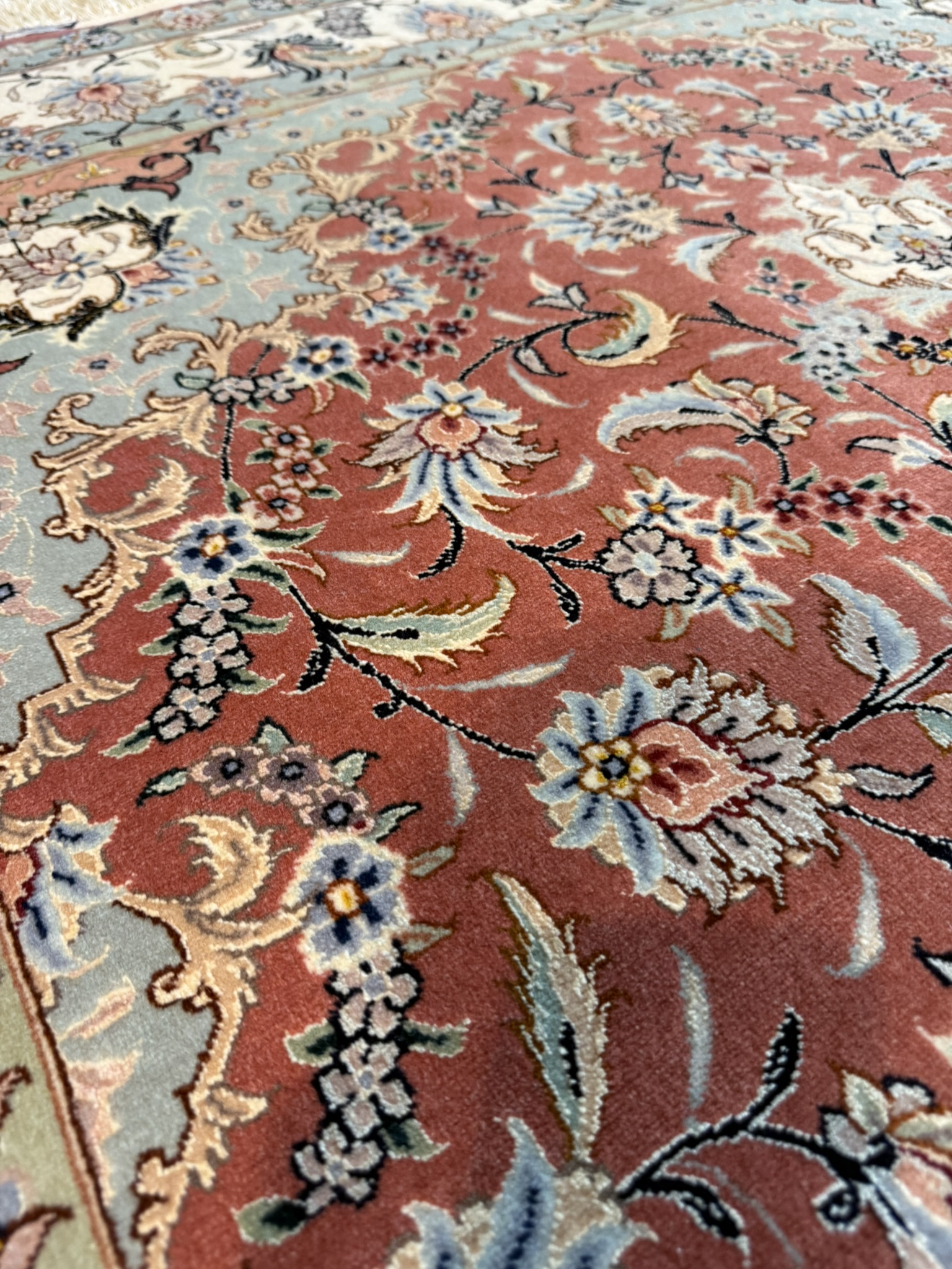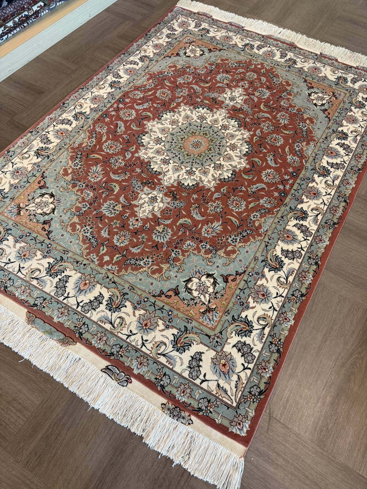 タブリーズ絨毯のノット数は「ラジ」という単位で表されますが、これは6.65センチ中のノット列を表したもので、最高級品では90ラジ(169万ノット)以上を数えるものもあります。