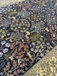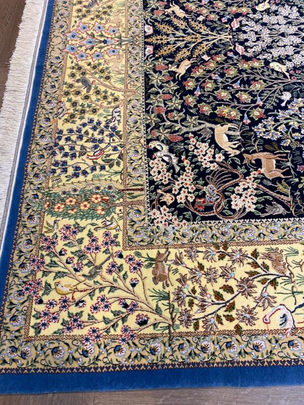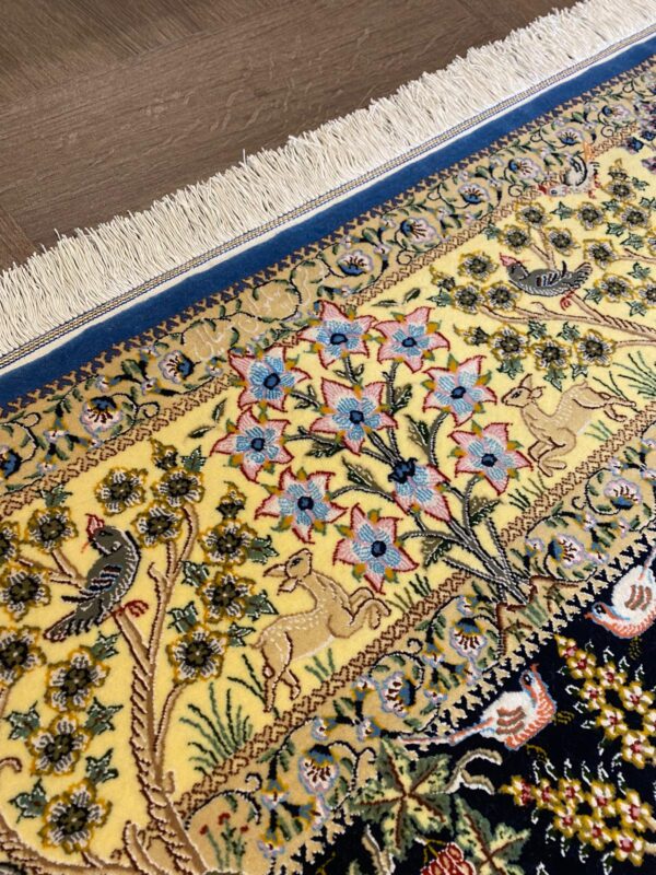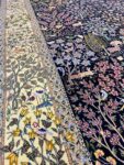 この「世界で一番明るい絨毯」はイスファハン絨毯同様に、複雑なメダリオンを繊細なイスリム文様が取り囲むデザインが一般的ですが、ドーム文様やタイル文様なども多く製作されており、こうした幾何学的な文様はその色調と相まってモダンな印象を与えます。