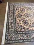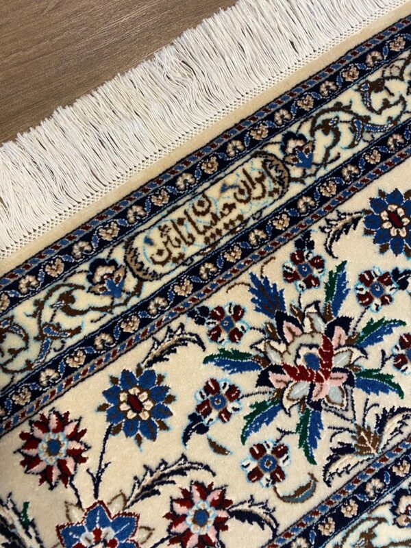 偽物は無銘のナイン絨毯にハビビアンの偽の銘を付け加えて作られますが、使われる糸は当然、絨毯そのものに使用されている糸と同じではありませんから、銘の部分だけ僅かに色が変わります。