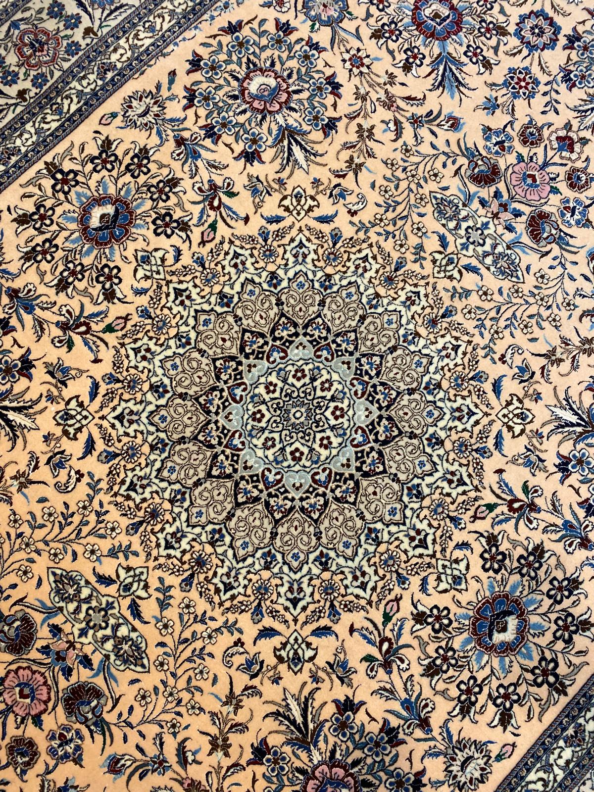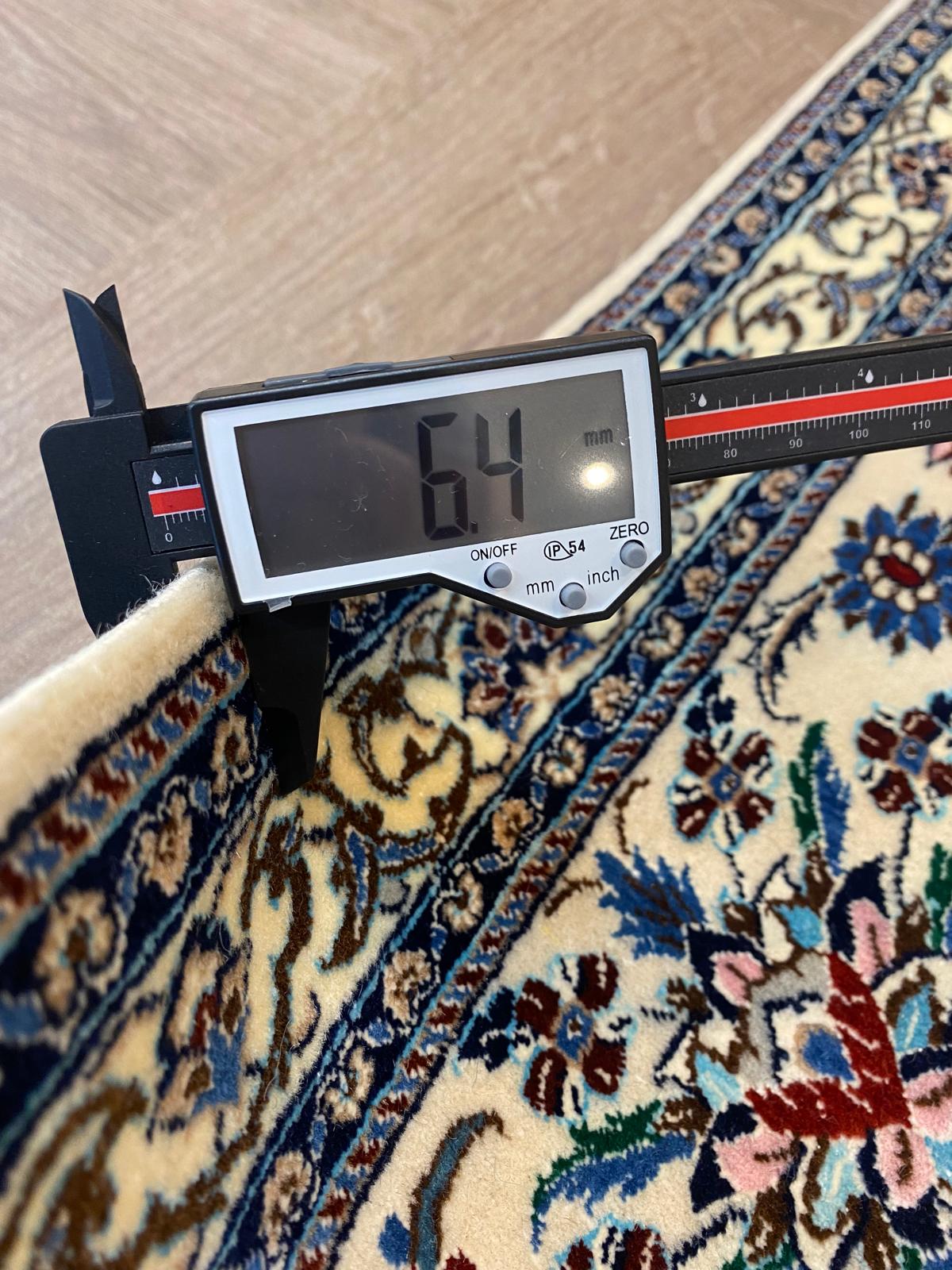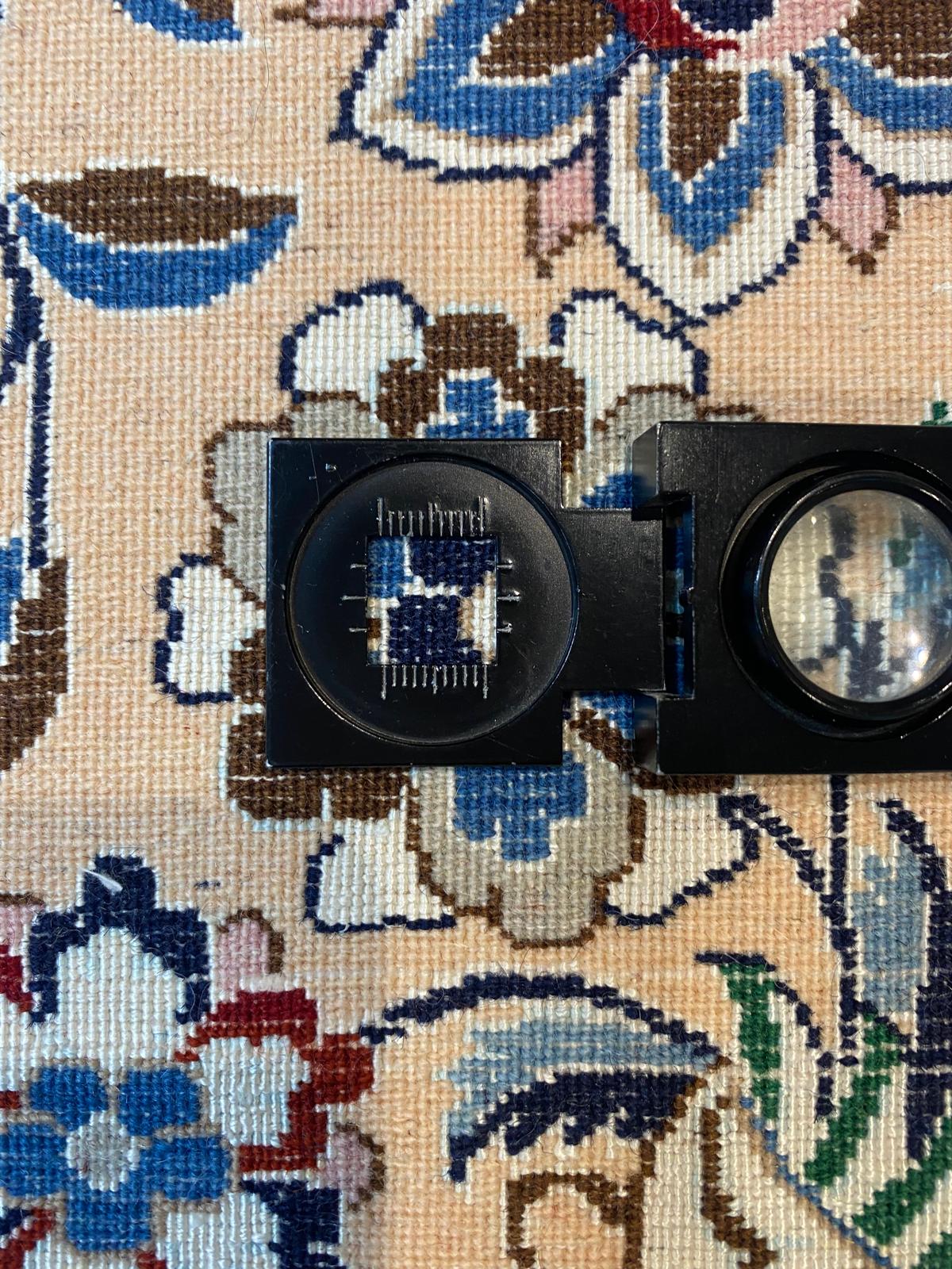 偽物は無銘のナイン絨毯にハビビアンの偽の銘を付け加えて作られますが、使われる糸は当然、絨毯そのものに使用されている糸と同じではありませんから、銘の部分だけ僅かに色が変わります。