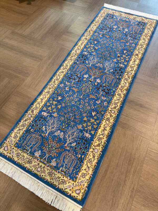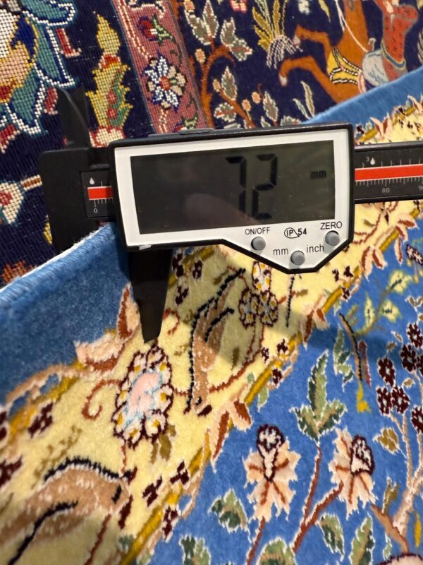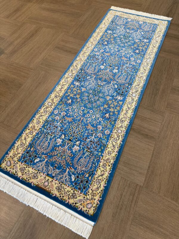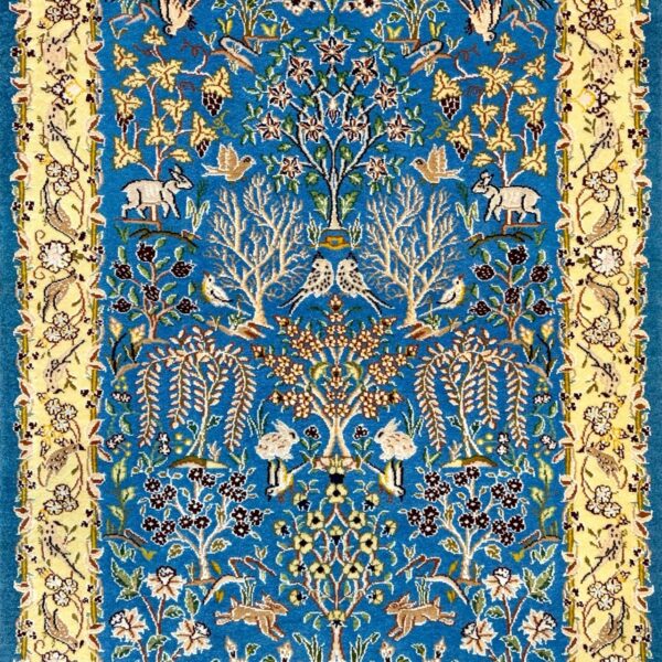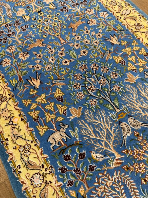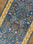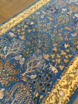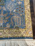 この「世界で一番明るい絨毯」はイスファハン絨毯同様に、複雑なメダリオンを繊細なイスリム文様が取り囲むデザインが一般的ですが、ドーム文様やタイル文様なども多く製作されており、こうした幾何学的な文様はその色調と相まってモダンな印象を与えます。