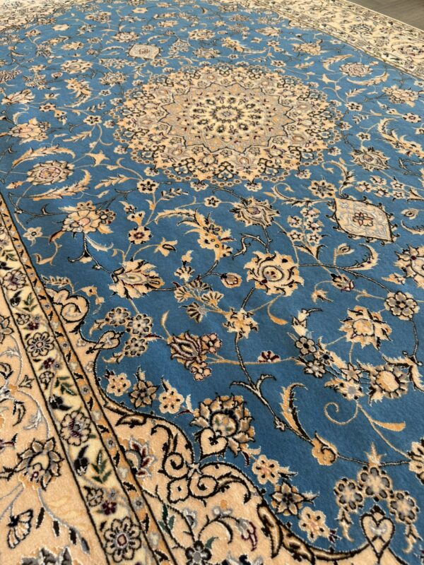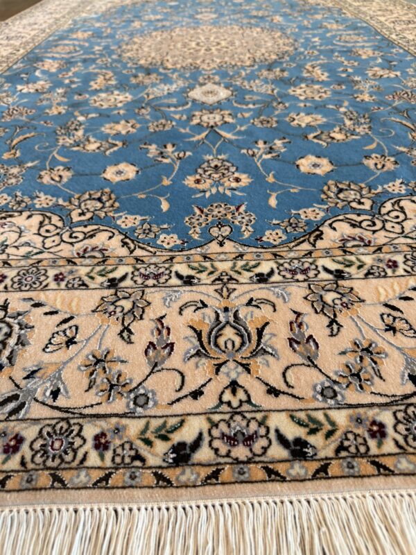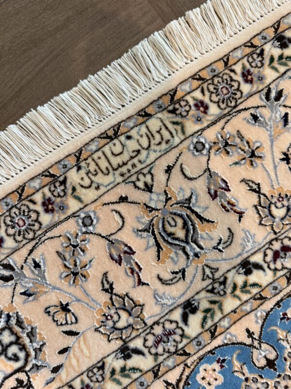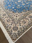 この「世界で一番明るい絨毯」はイスファハン絨毯同様に、複雑なメダリオンを繊細なイスリム文様が取り囲むデザインが一般的ですが、ドーム文様やタイル文様なども多く製作されており、こうした幾何学的な文様はその色調と相まってモダンな印象を与えます。