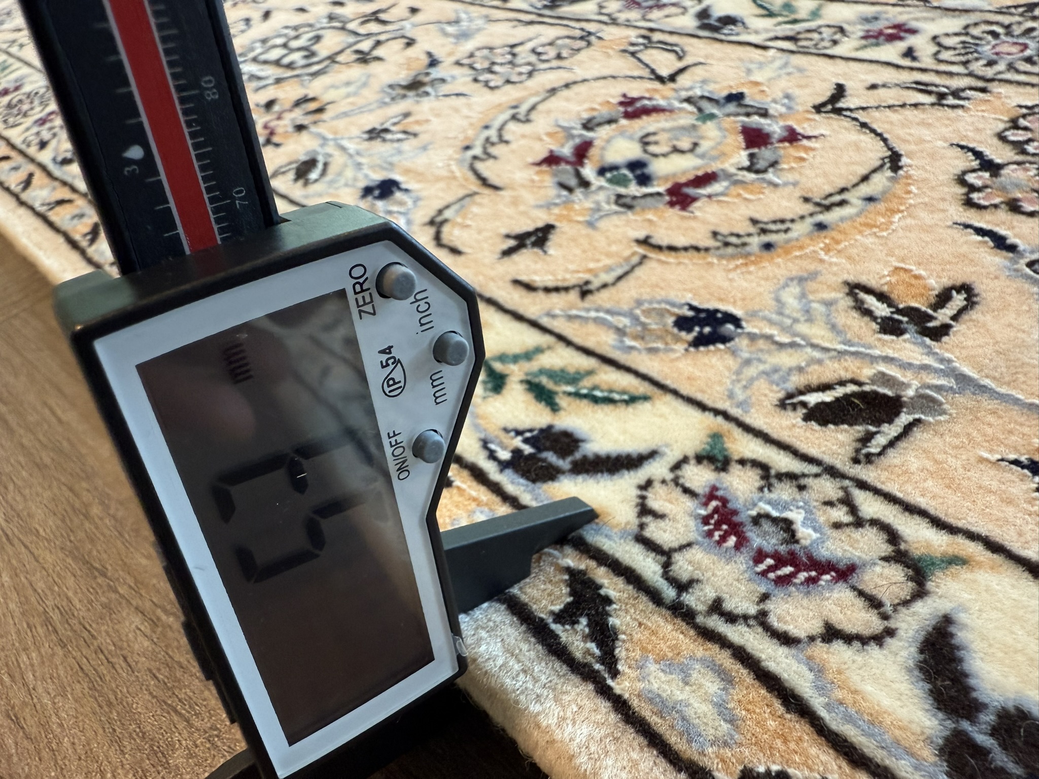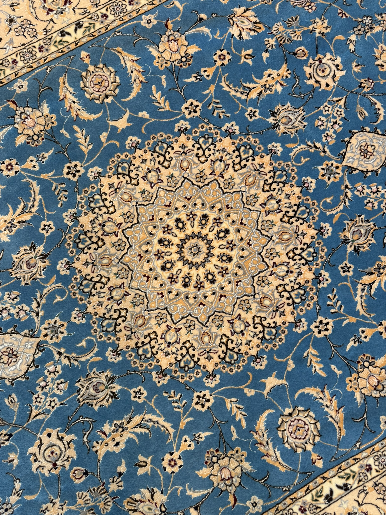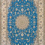 この「世界で一番明るい絨毯」はイスファハン絨毯同様に、複雑なメダリオンを繊細なイスリム文様が取り囲むデザインが一般的ですが、ドーム文様やタイル文様なども多く製作されており、こうした幾何学的な文様はその色調と相まってモダンな印象を与えます。
