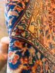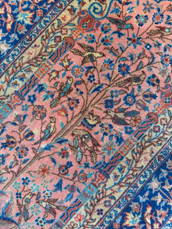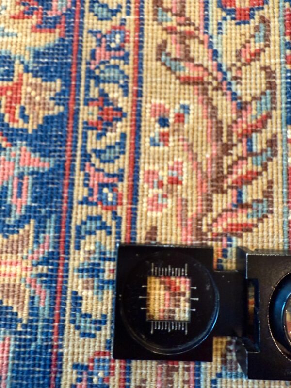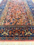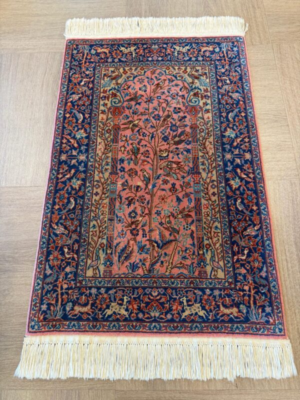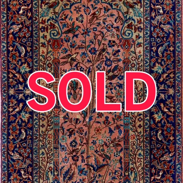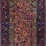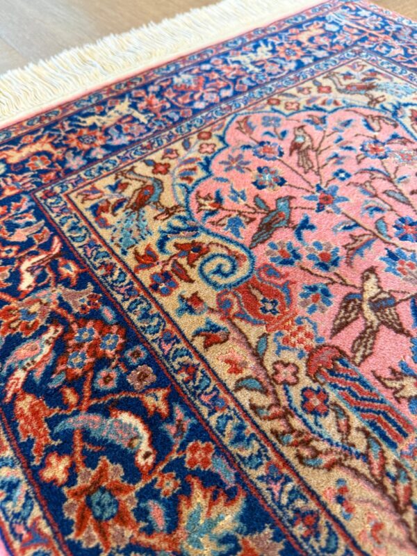 ミフラブ文様と樹木文様を組み合わせたデザインは当時のカシャーンやテヘランで流行したものですが、本作ほどに精緻な図柄を表現するには緻密な織りが不可欠です。