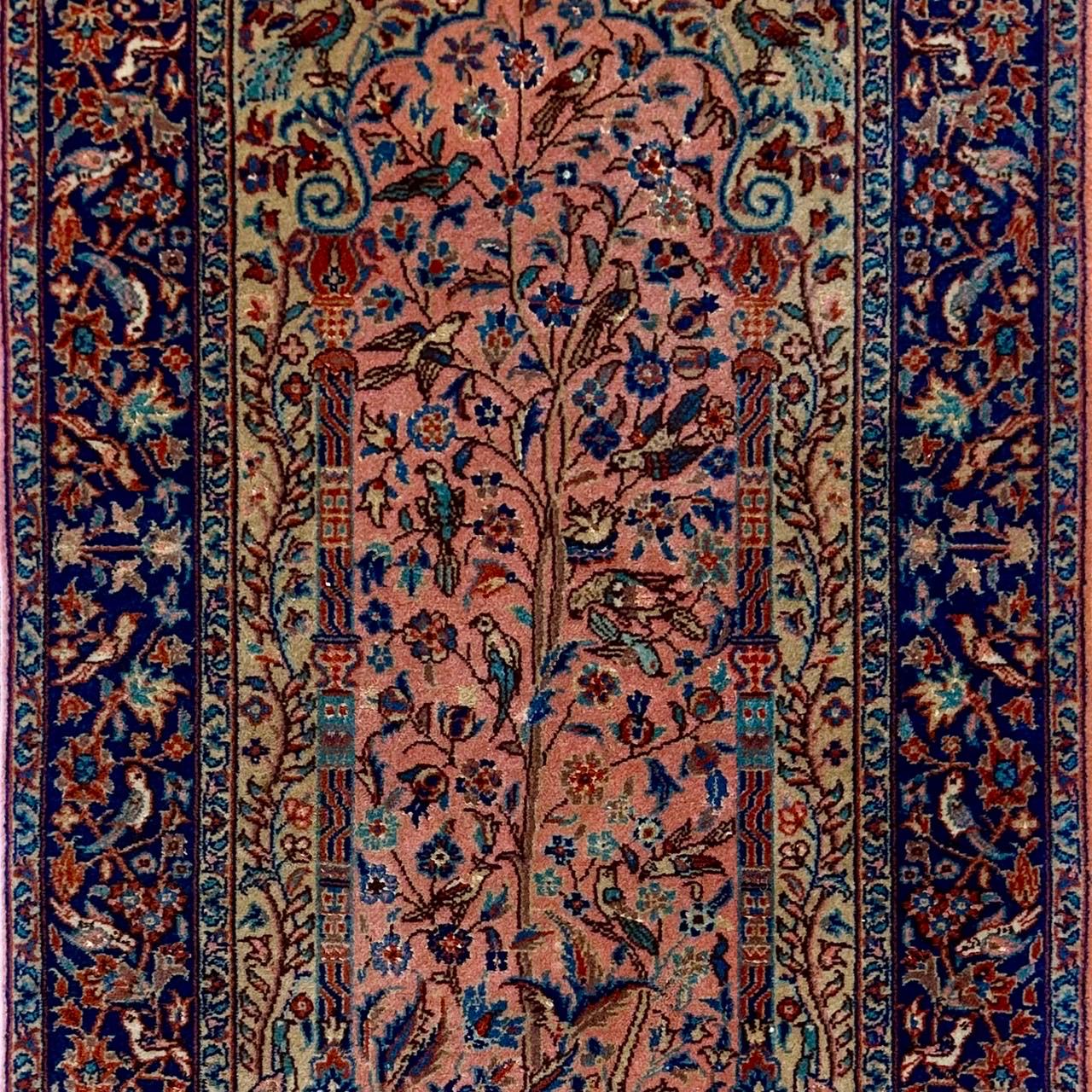 ミフラブ文様と樹木文様を組み合わせたデザインは当時のカシャーンやテヘランで流行したものですが、本作ほどに精緻な図柄を表現するには緻密な織りが不可欠です。