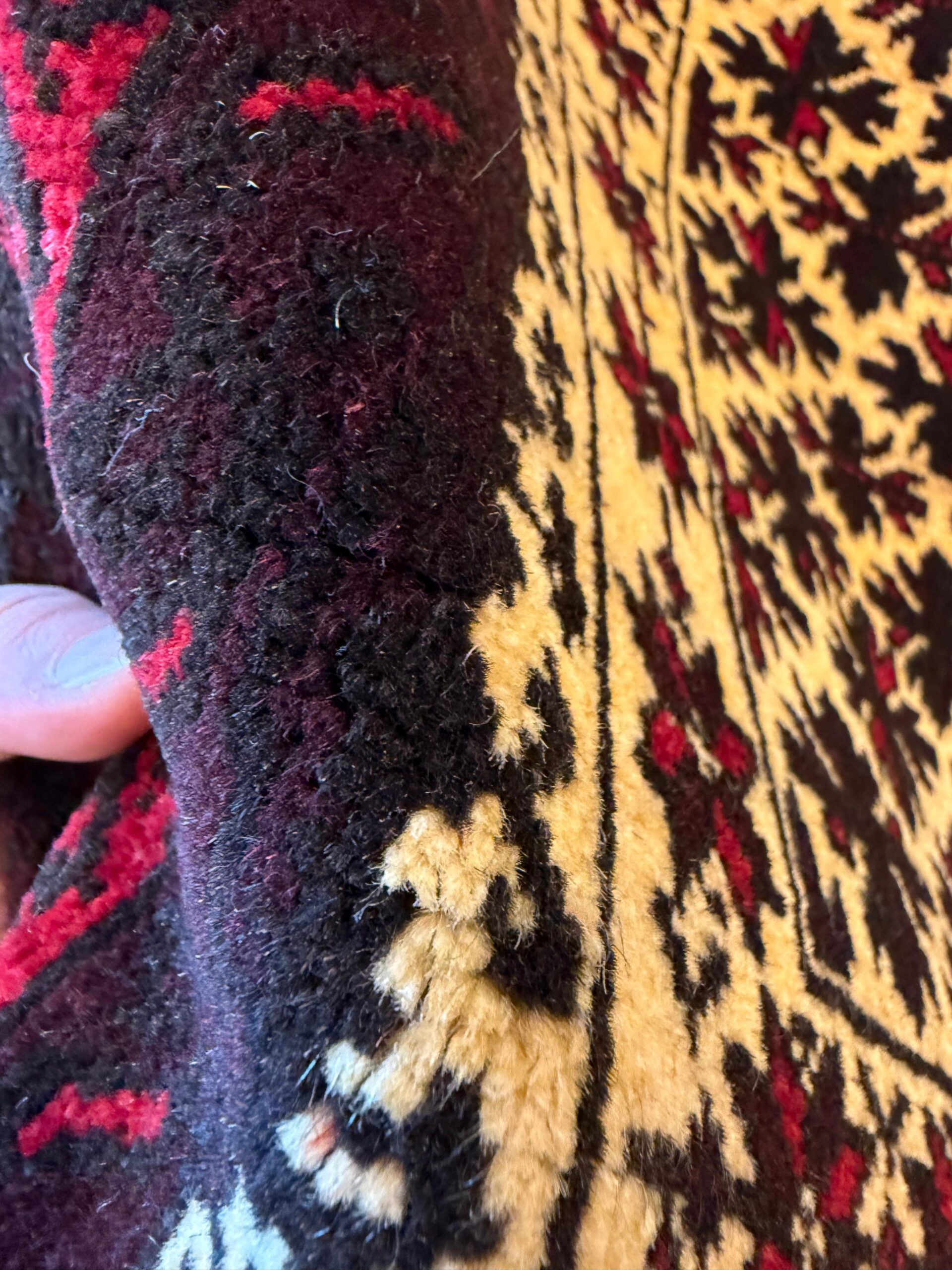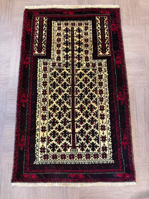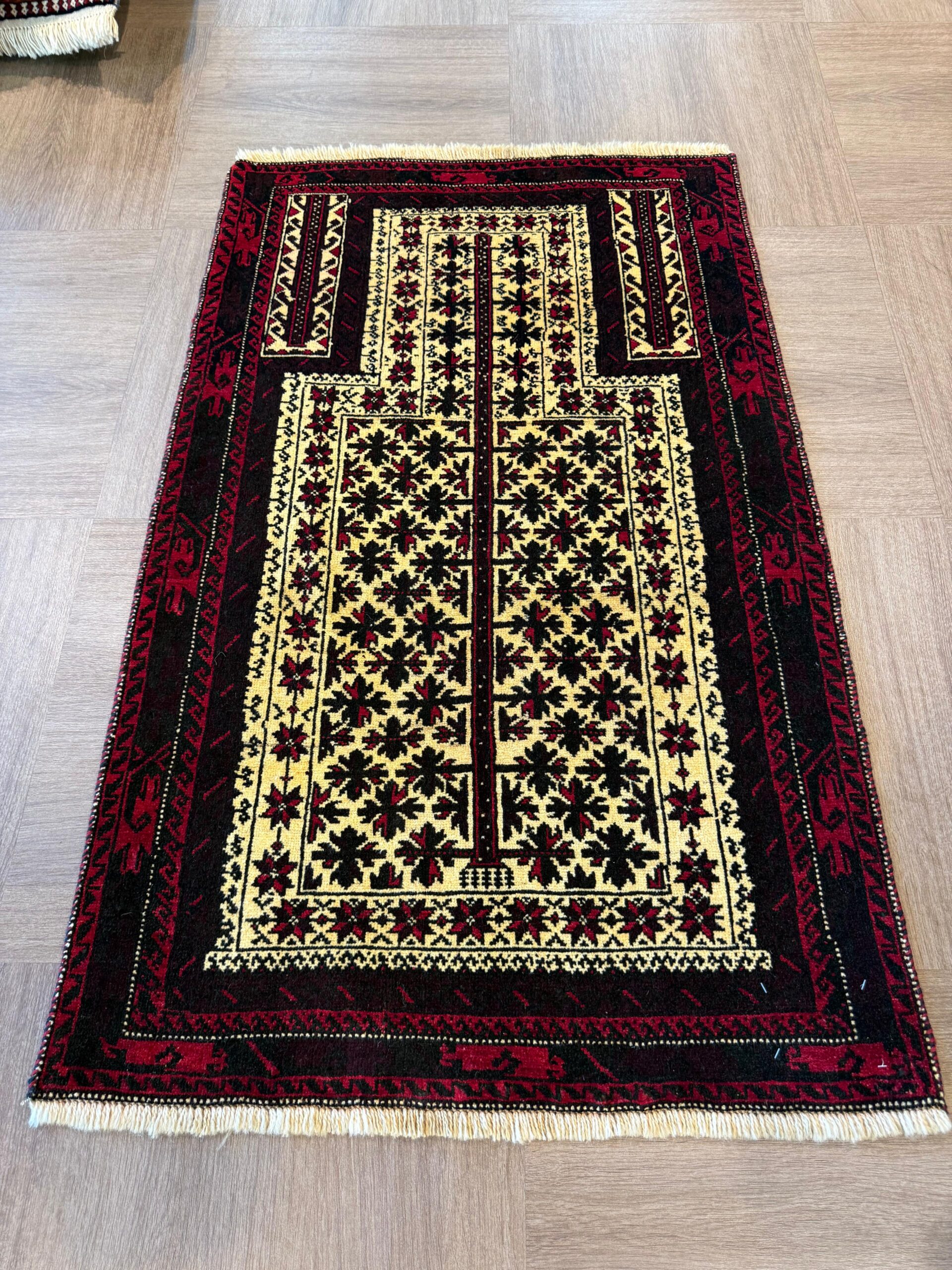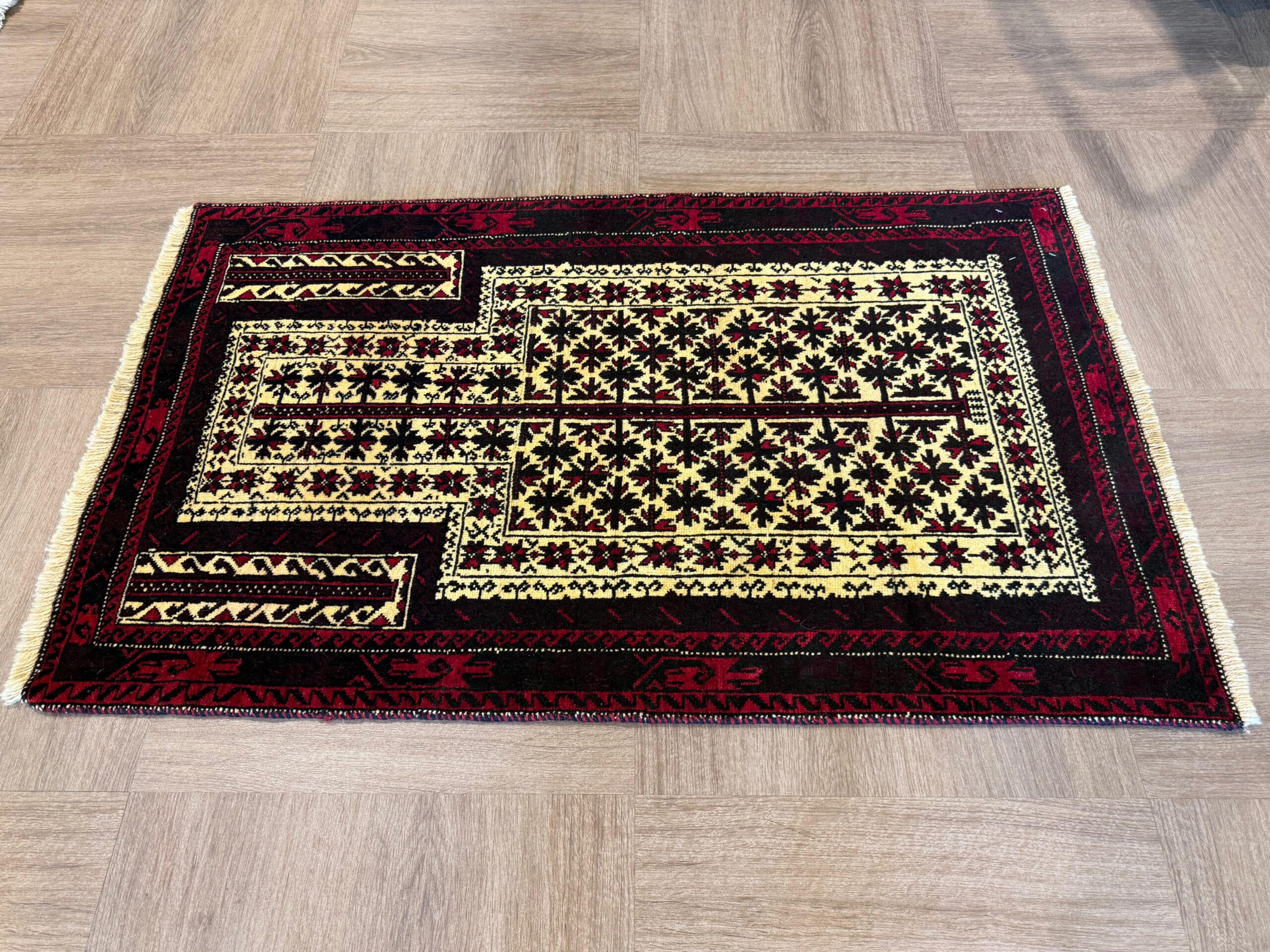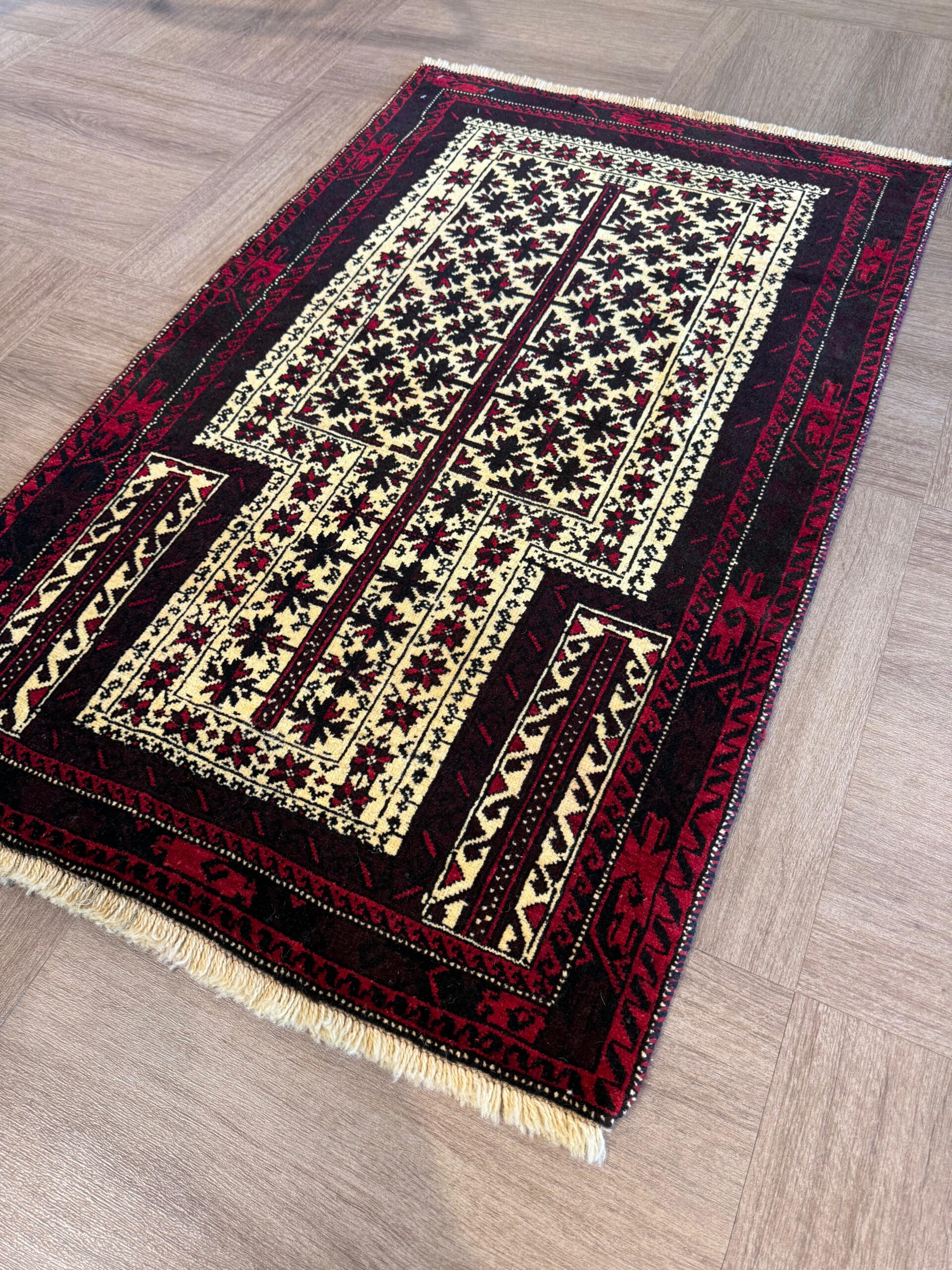 イランでは比較的小さなサイズが大半で、3平米以上のものはほとんど見かけませんが、アフガニスタンでは大きなサイズのバルーチ絨毯も製作されています。