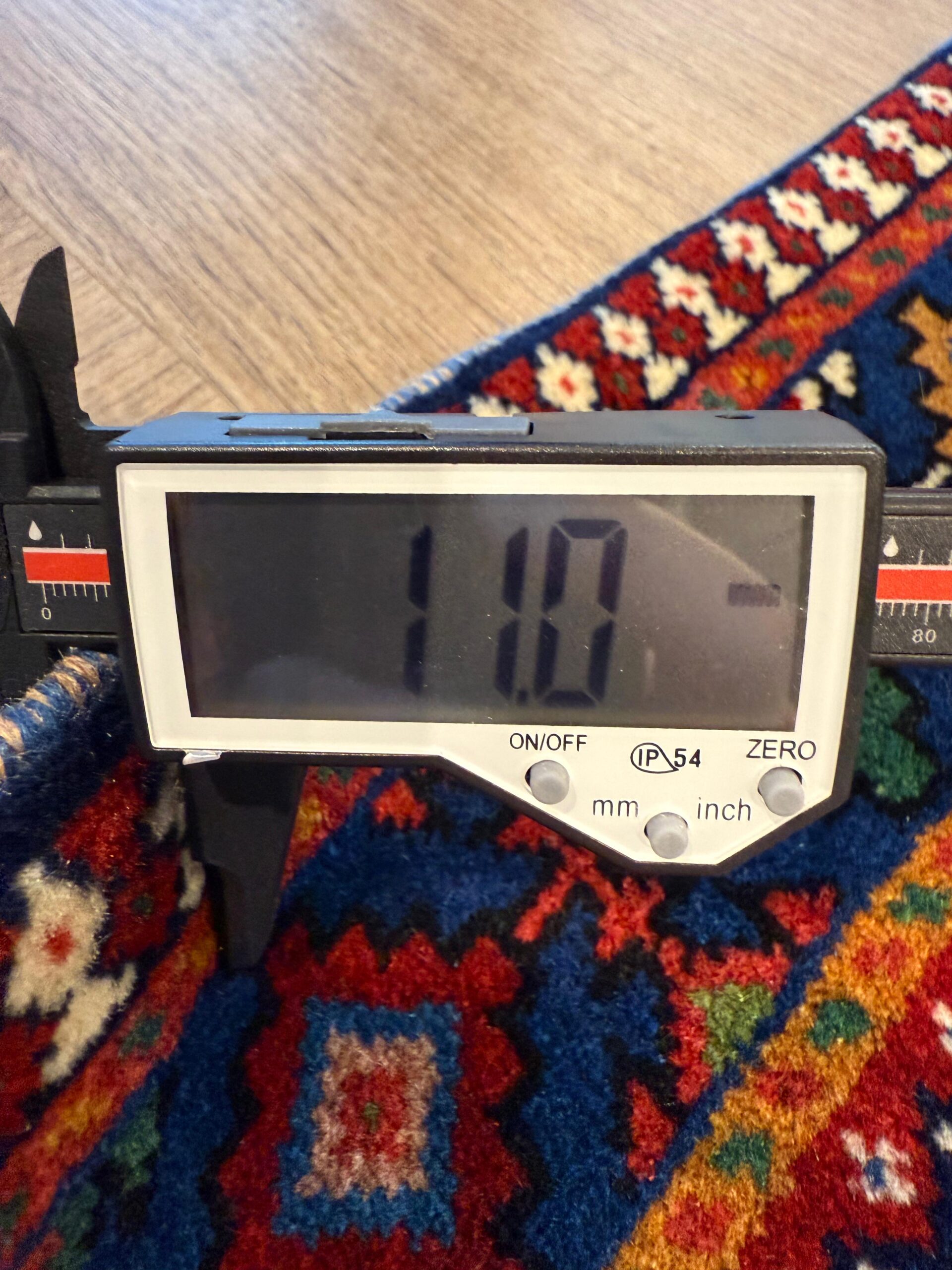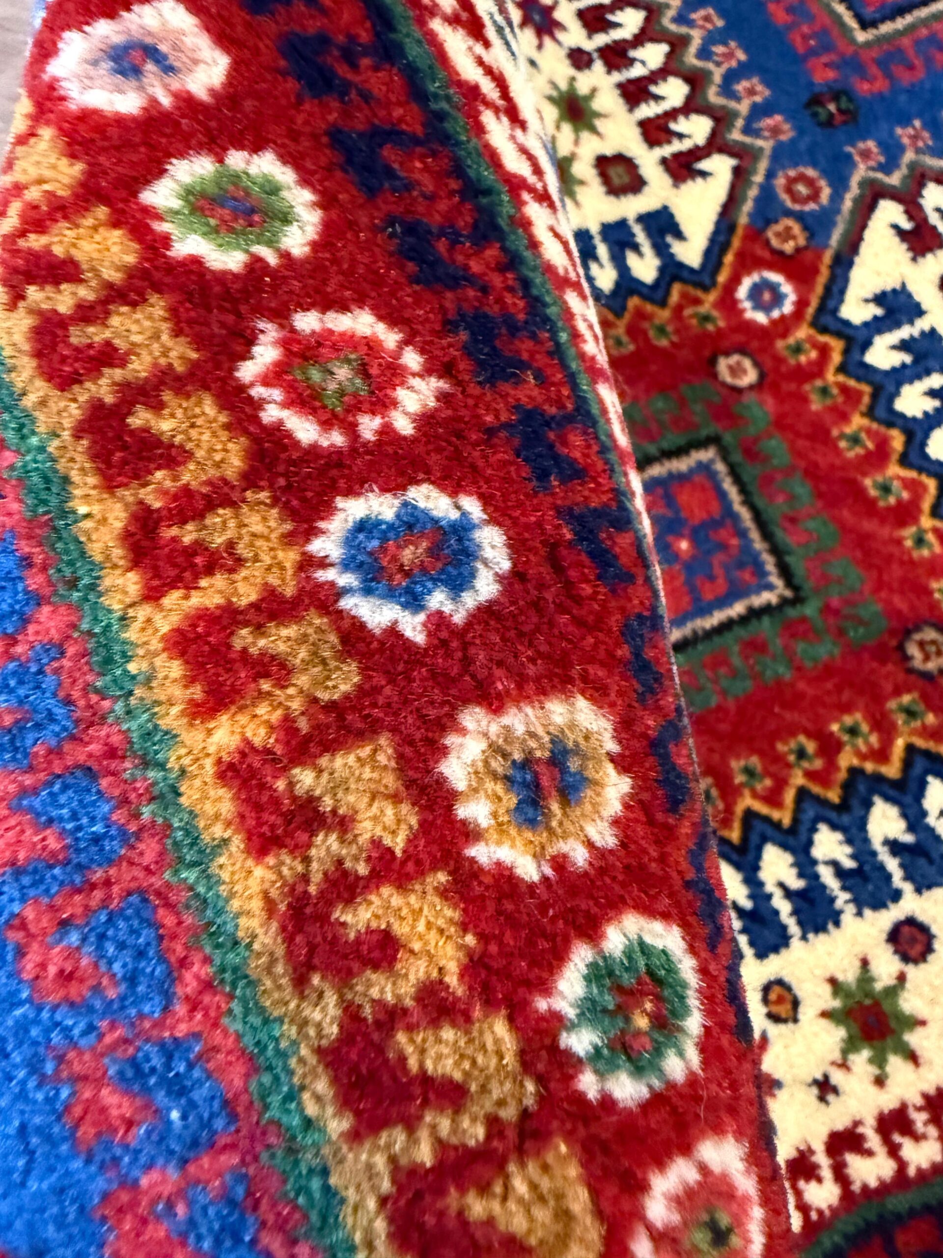 ペルシャ結びが用いられますが、1平米あたり16万ノットから25万ノットほどと部族の絨毯としては質は高く、しなやかながら耐久性があります。