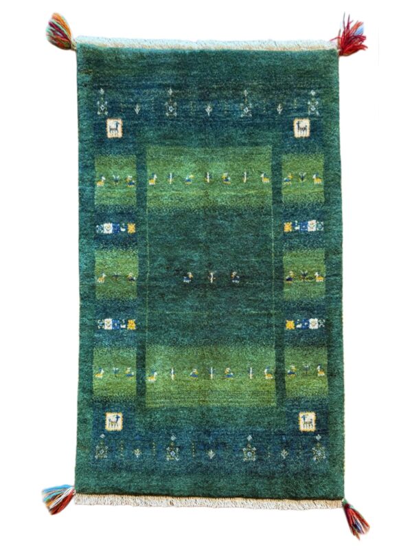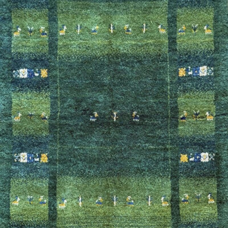 ギャッベには一般的な「ギャッベ」と、ノット数のやや多い「ギャッベ・リズ」があります。 随所に配置された羊や樹木がアクセントになっており、シンプルでありながらも退屈させないデザインです。
