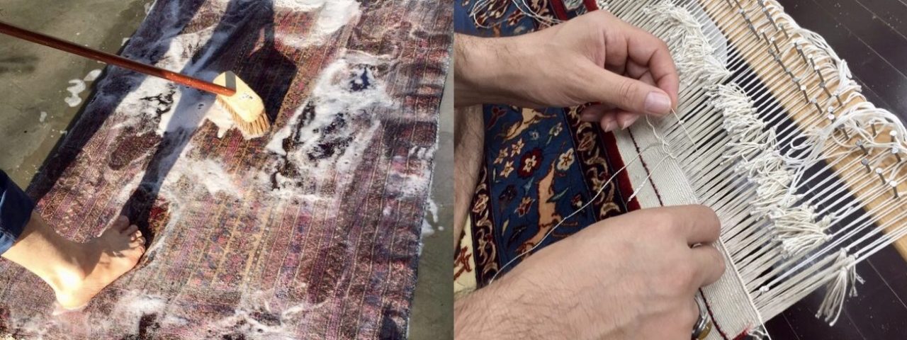 手織絨毯には専門家によるメンテナンスが不可欠。当社でお買上いただいた絨毯は、イランで修業を積んだプロのクリーニング・修理職人が作業を行います。